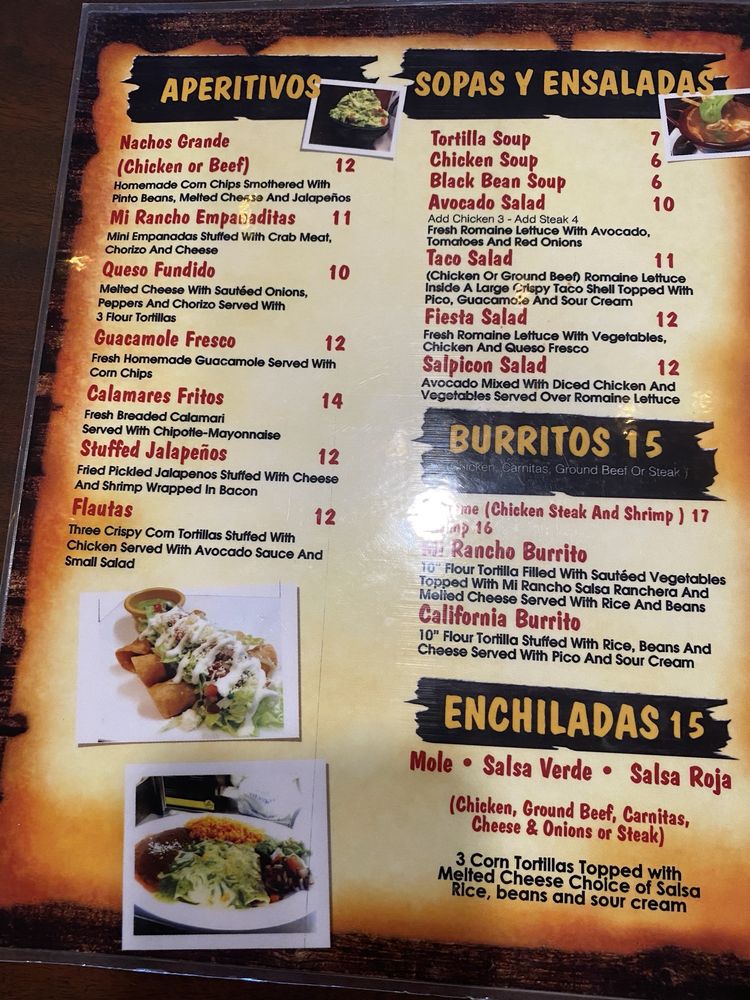 Chicken, steak, shrimp and chorizo. Sizzling peppers and onions in Mi Rancho homemade fajita mole sauce. Served with rice, beans and three flour tortillas.