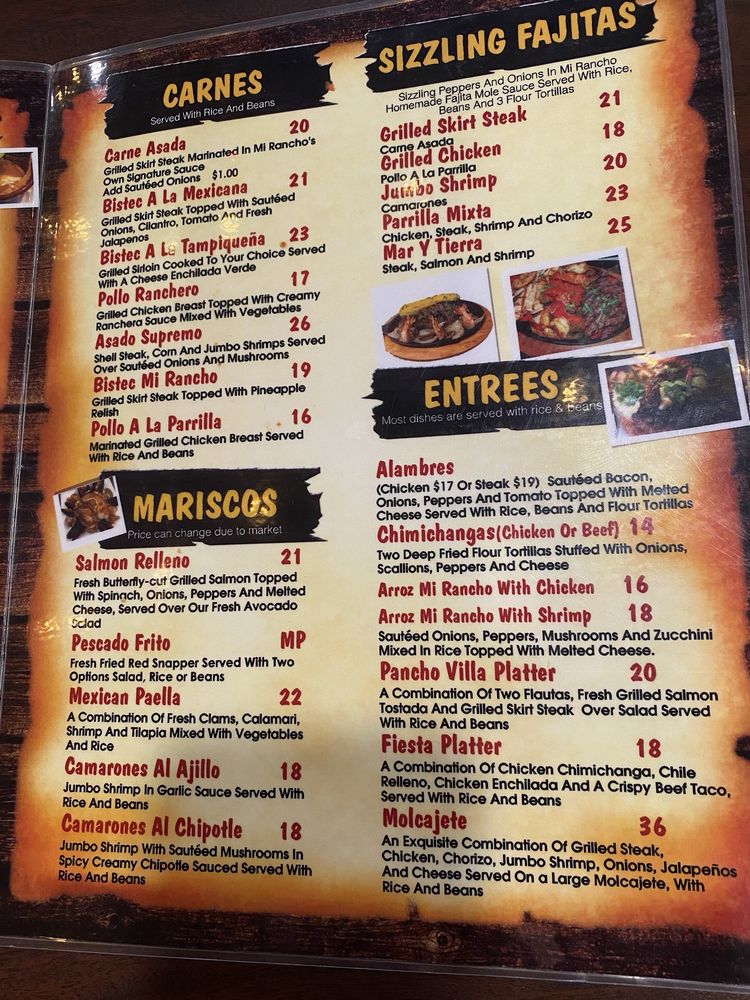 Sizzling peppers, steak, salmon, shrimp and onions in Mi Rancho homemade fajita mole sauce. Served with rice, beans and three flour tortillas.